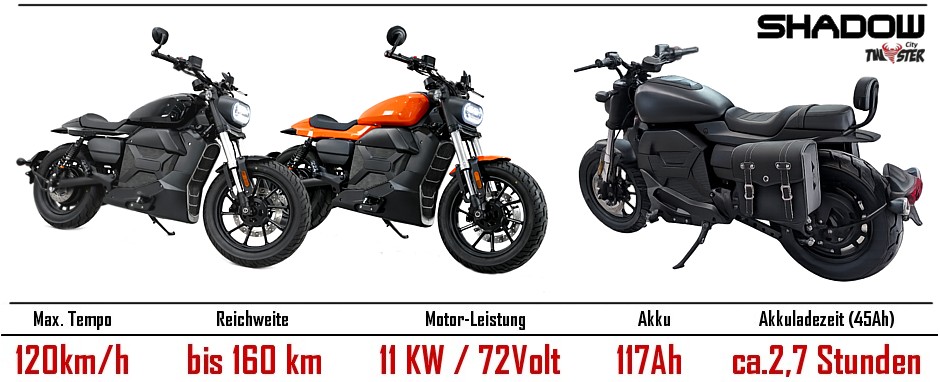 E-Motorrad Elektromotorrad CityTwister SHADOW-PRO 11000W / 72V / 117ah / 120 km/h Ladesäulen IEC Typ 2 Stecker (Kopie)