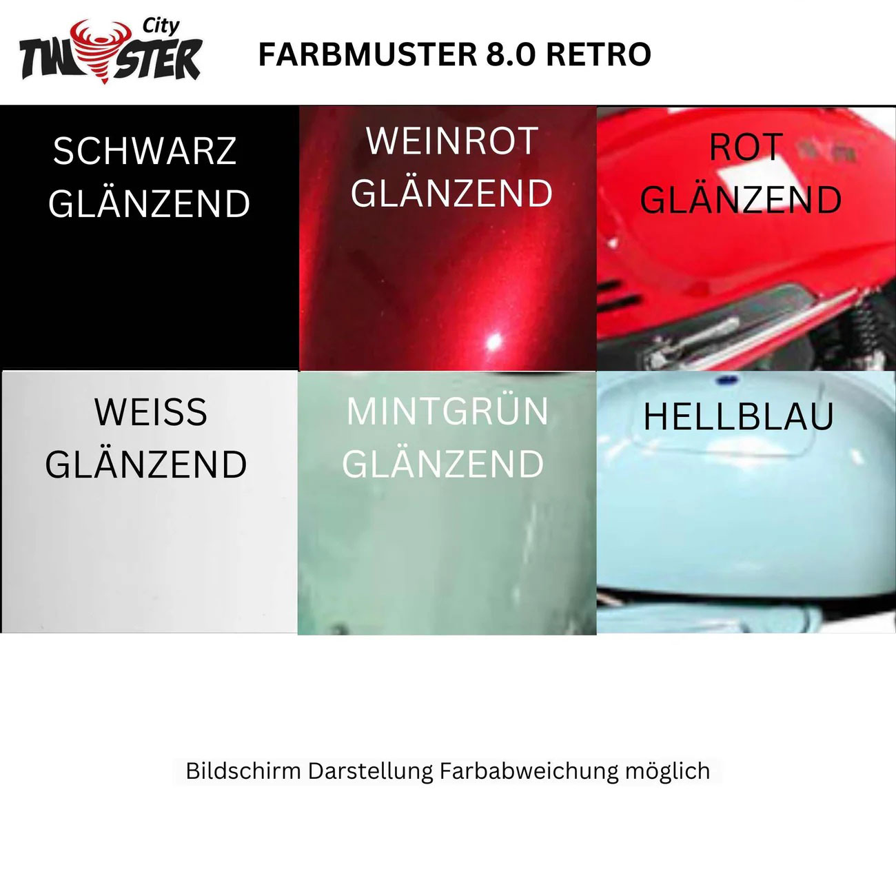 Der stylische Elektro-Roller CityTwister 8.0 RETRO von CityTwister mit Weisswandreifen und wartungsfreiem 3000 Watt-Motor beschert Ihnen tollen Fahrspass. Der Coolheits-Faktor garantiert immer einen tollen Auftritt. Mit Europäischer Straßenzulassung (EU COC)!